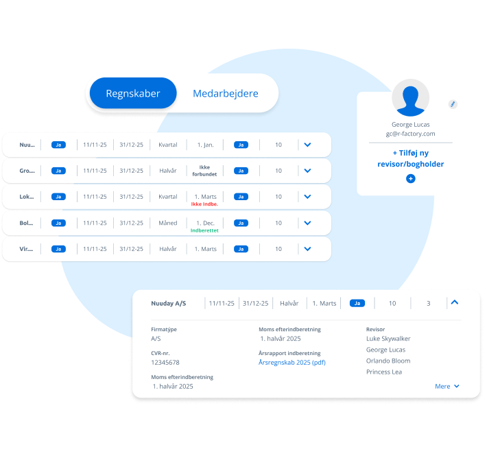 • Få et overblik over dine kunders regnskaber og dine medarbejdere