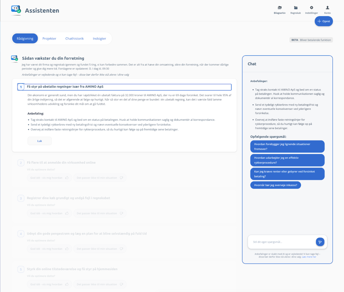 Assistenten er proaktiv og fortæller dig, hvad der skal ske. Det gør den i form af et kort, som du så i eksemplet tidligere. Kortet giver dig altid mulighed for at udføre en konkret handling – fx sende en rykker, registrere betaling på en faktura eller bogføre udgifter.