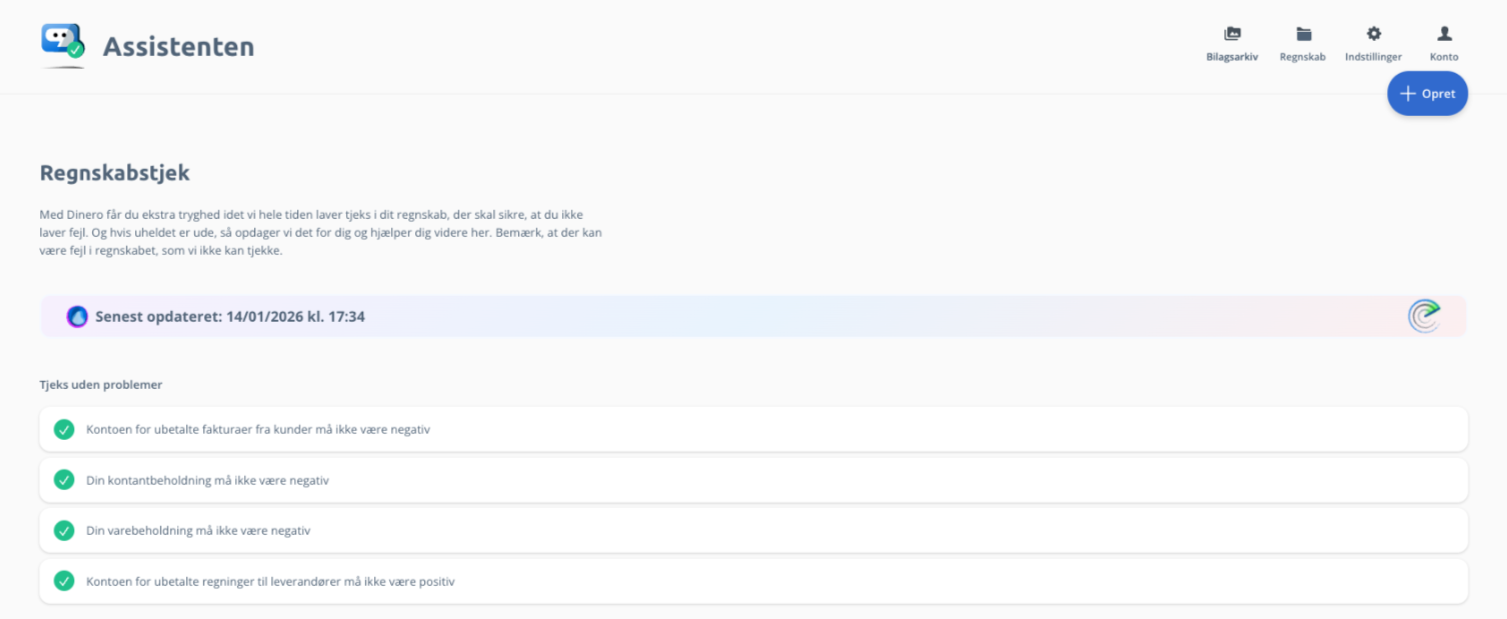 Den viser dig både tjek uden problemer og tjek, som kræver din opmærksomhed. Du kan se en forklaring ved at folde tjekket ud, og du kan nemt klikke dig videre til saldobalancen.