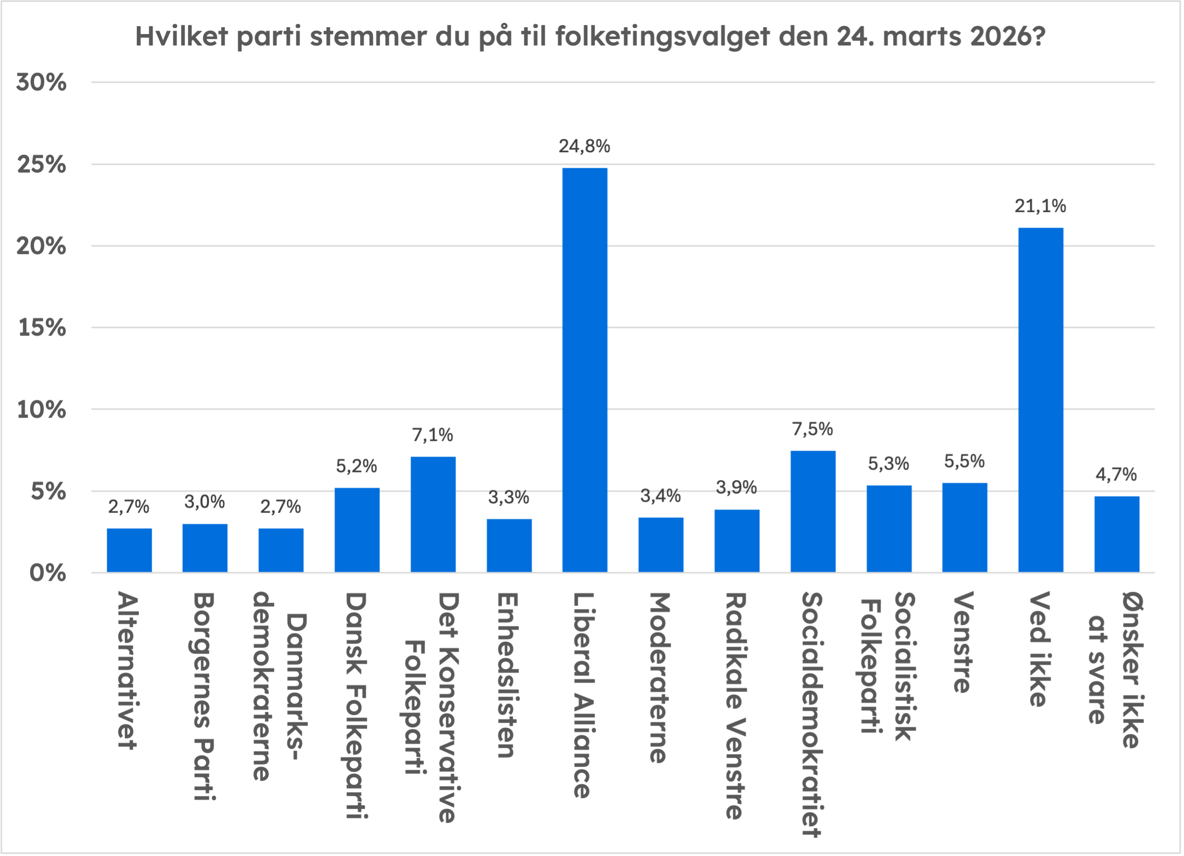 Undersøgelsen viser, at Liberal Alliance står til at blive den helt store stemmesluger med næsten 25 procent af stemmerne. De efterfølges af Socialdemokratiet med 7,5 procent og Det Konservative Folkeparti med 7,1 procent.
