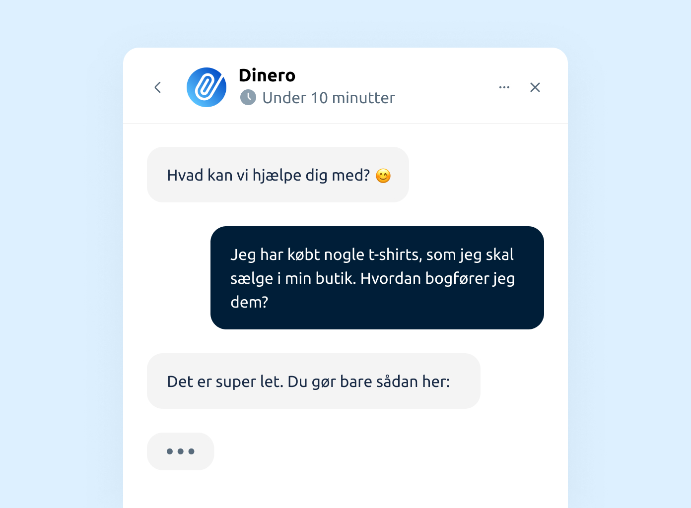 Sidder du tit fast i bogføringen? Med Dinero Pro kan du stille alle spørgsmål, du vil, til vores bogholdere. De sidder klar på chatten til at svare på de mest almindelige spørgsmål om bogføring hver dag mellem kl. 8.00-23.00.
