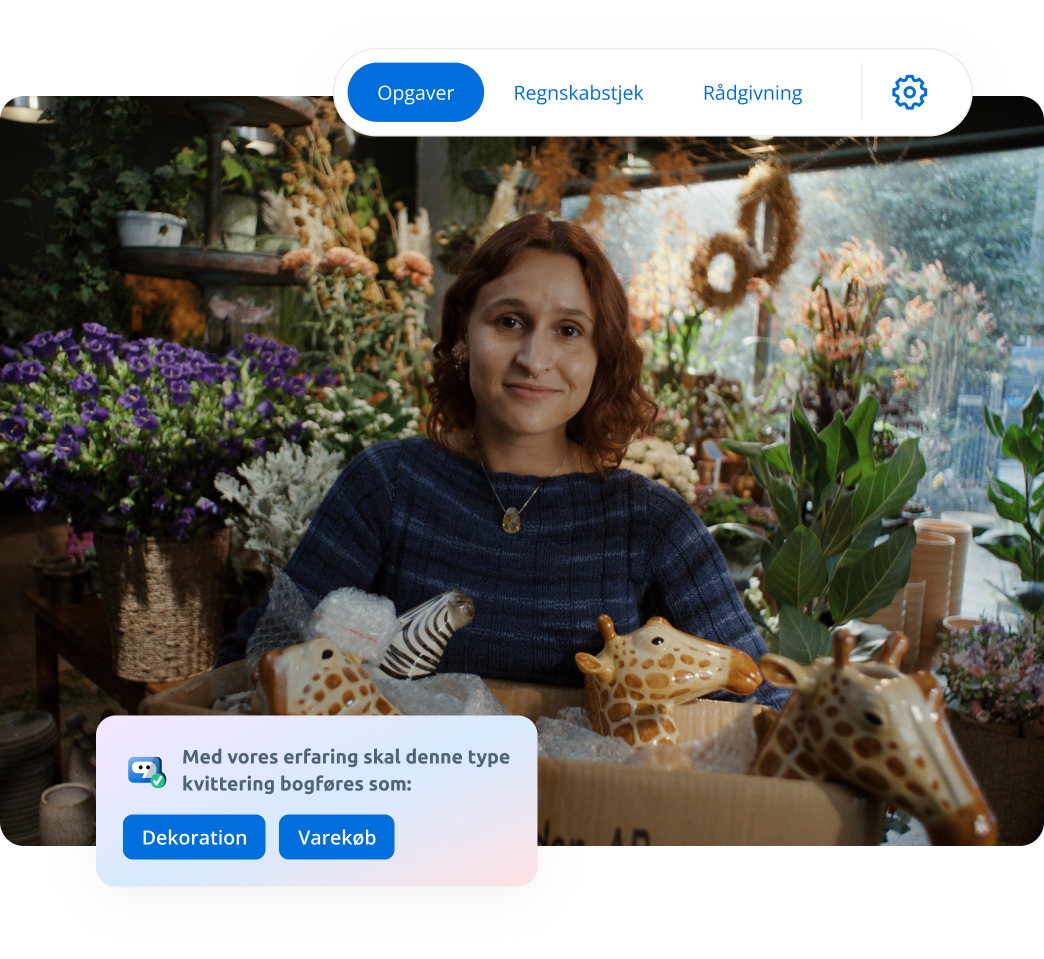 Assistenten kommer med forslag til, hvordan du skal bogføre, så du ikke længere skal gætte. Skriver du “blomster” i feltet, får du automatisk et forslag til, hvordan du skal bogføre.