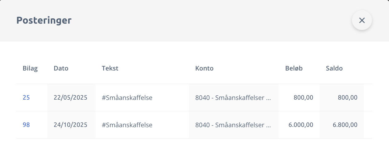 For at se, om du overholder denne regel, skal du gå til Regnskab (år 2025 ) Rapporter Saldobalance Find konto 8040 – Småanskaffelser (straksafskrivning) Klik på den lille tabel Se i kontoudtoget om der er enkelte bilag (beløb), der overstiger 34.400 ekskl. moms.