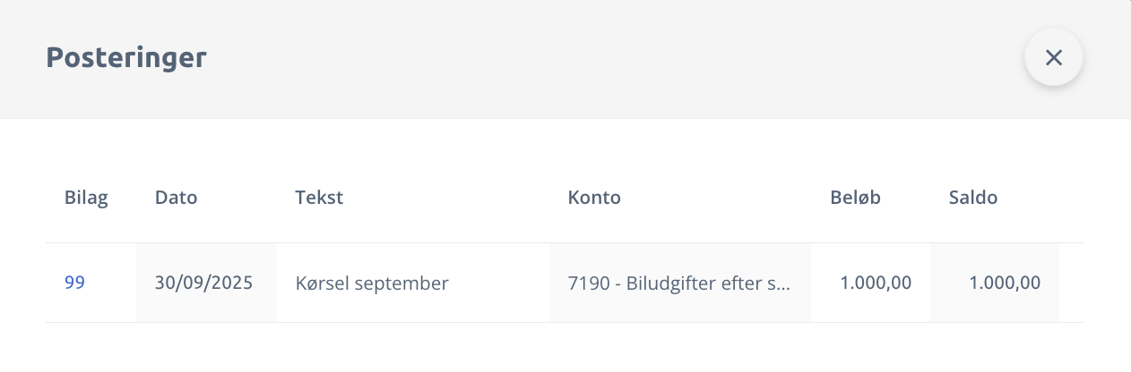 Det gør du ved at klikke ind på de enkelte bilag. Det er vigtigt, de er bogført med vores skabelonen kørsel eller i et finansbilag mellem konto 7190 – Biludgifter efter statens takster og modkonto 60100 egenkapital.