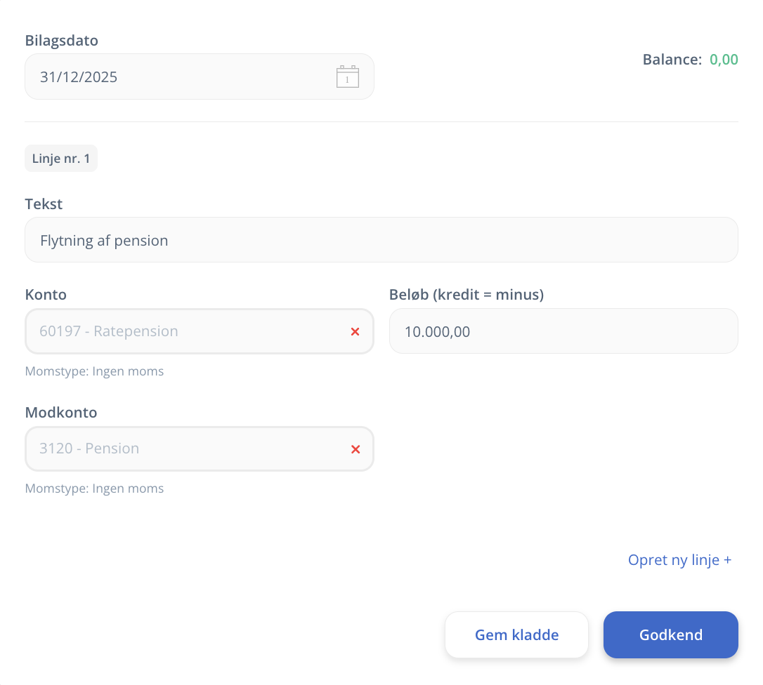 Har du bogført pension til dig selv som ejer på konto 3120 – Pension, skal du “flytte” værdien af pensionen til konto 60197. Det gør du i et Finansbilag, som ligger under fanen Bogføring.
