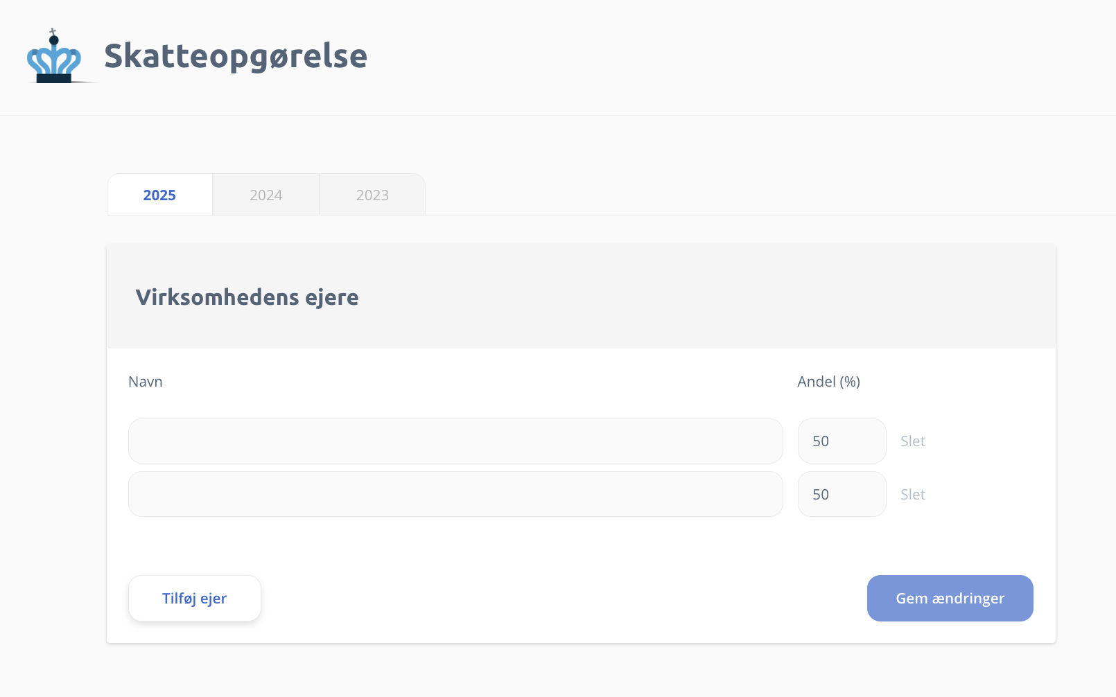 Der er nemlig en lille tilføjelse. Da oplysningsskemaet indberettes personligt for hver ejer, skal I også have opdelt virksomheden skattemæssige overskud eller underskud i mellem jer. Det gør I ved at indtaste ejerne på den første side, når I er på Skatteopgørelsen-siden i regnskabet.