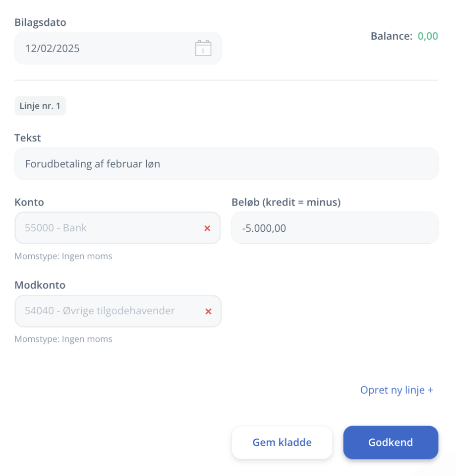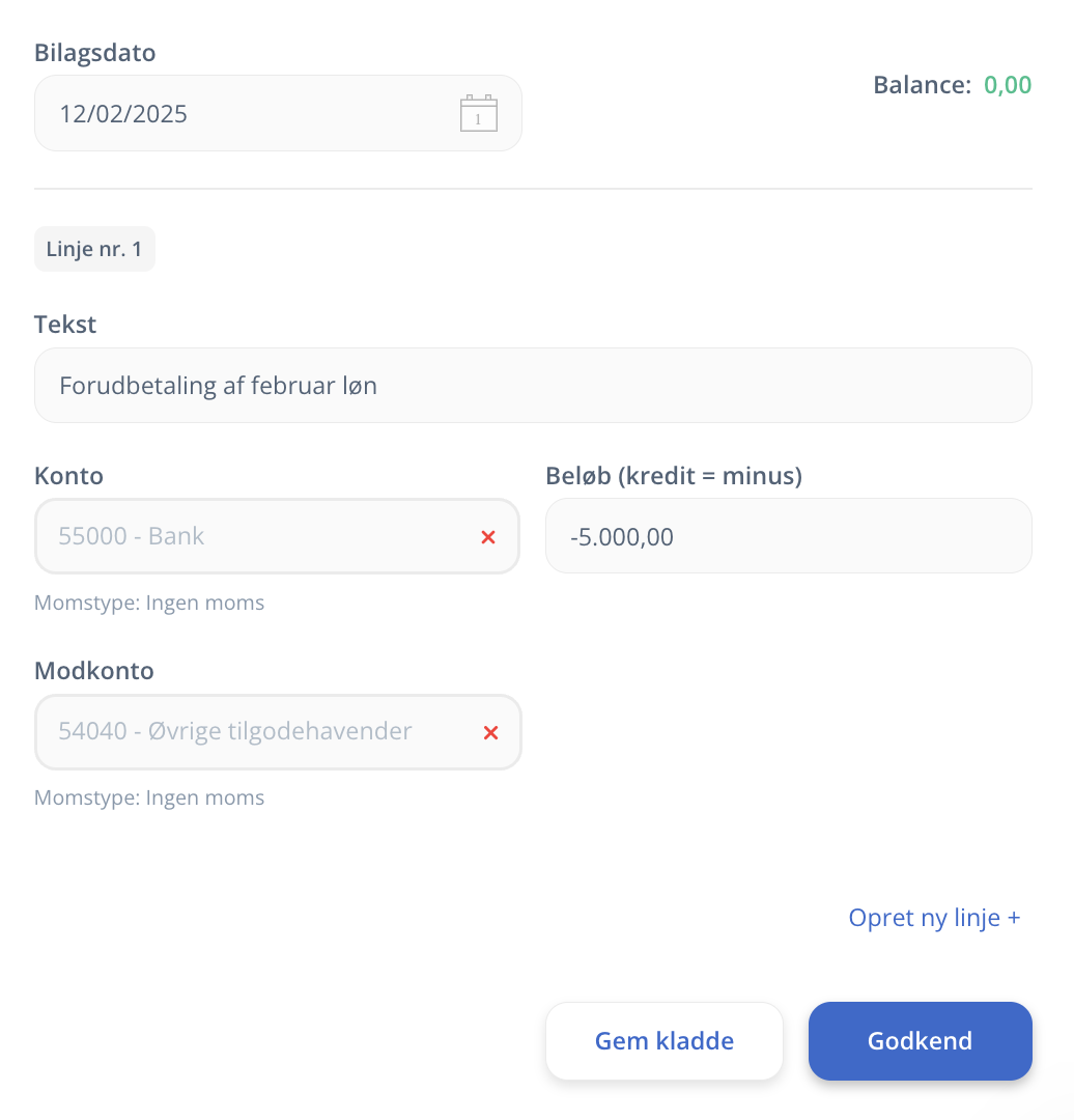 I dette eksempel har medarbejderen fået forudbetalt 5.000 kr., som er overført d. 12/2-2025.