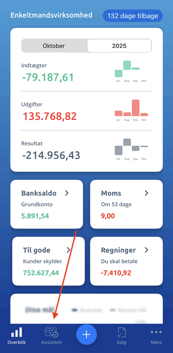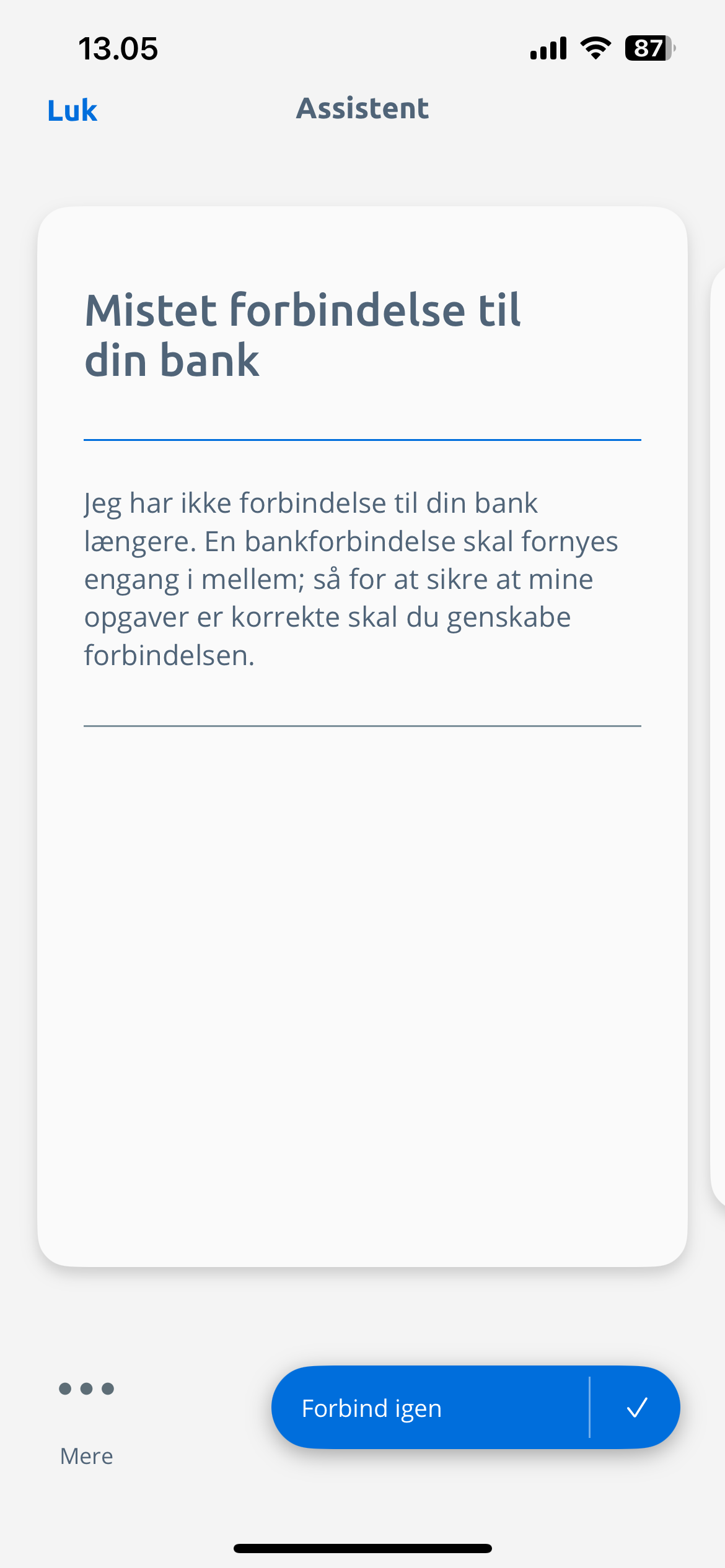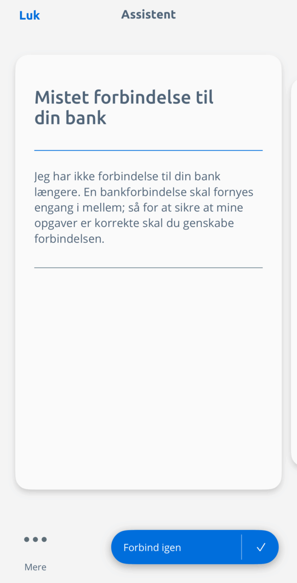 Her har Assistenten opdaget, at vi har mistet forbindelsen til din bank. Derfor kommer den med et forslag om at forbinde igen, og du kan gøre dette direkte via Assistenten.
