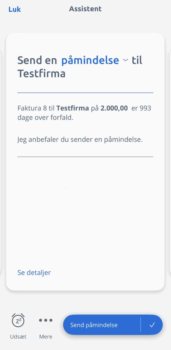 Her har Assistenten bemærket, at du har en faktura, som ikke er registreret betalt. Derfor foreslår den at sende en påmindelse til kunden.