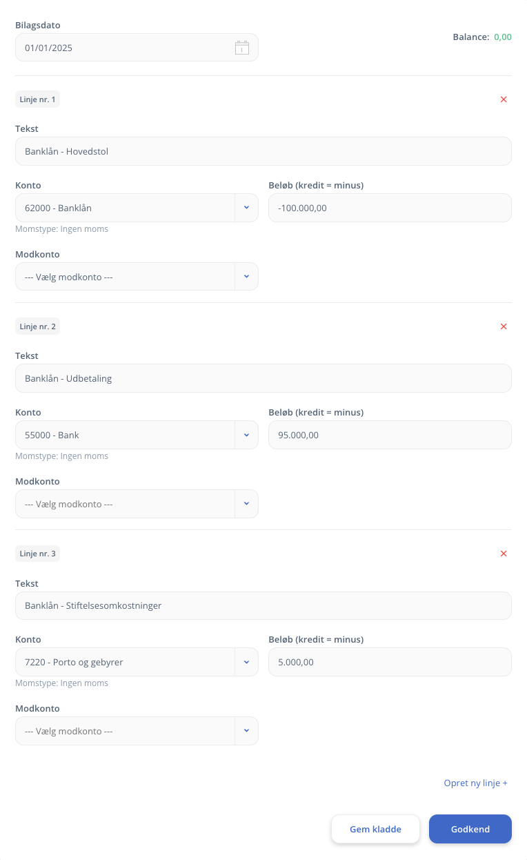 Det kan også ske, at der er nogle stiftelses omkostninger på et lån. F.eks. et scenarie her, hvor vi låner 100.000, men kun får de 95.000 udbetalt. De resterende 5.000 kroner, er noget vi skal betale banken for, at optage lånet. Bemærk vi har 3 linjer, ingen modkonti og kig godt efter plus og minus: