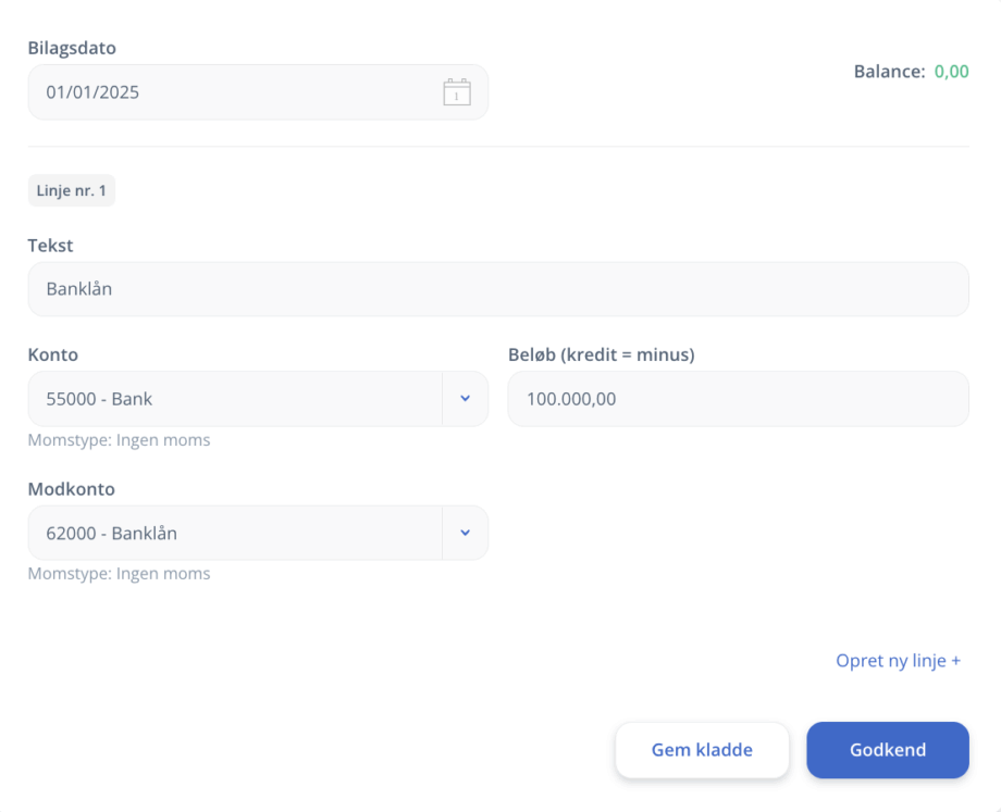 I ovenstående har vi nu bogført, at du har fået indsat 100.000 kroner på din bankkonto pga. lånet.