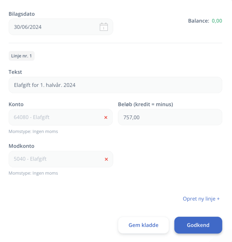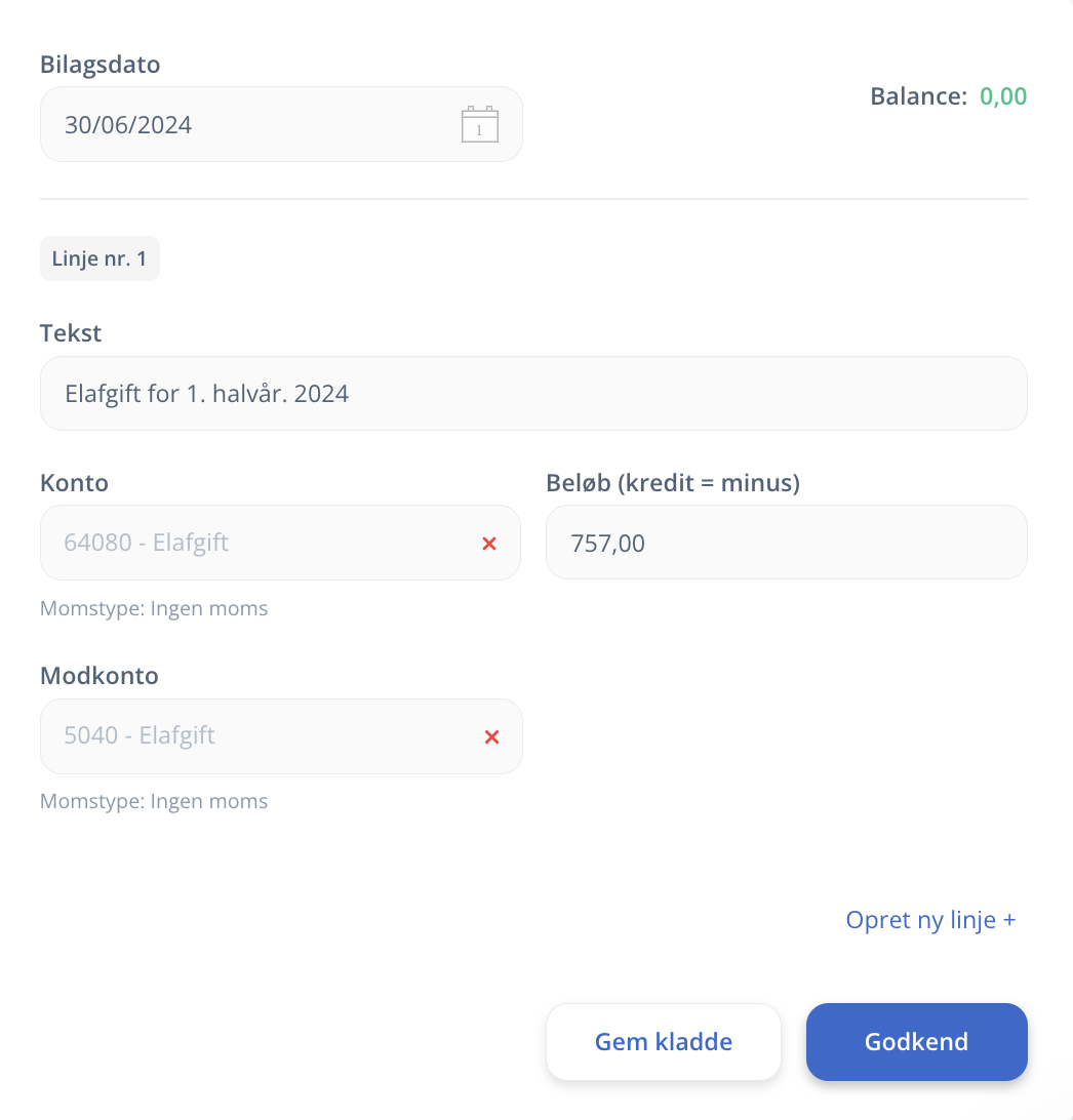 Du kan herunder se, hvordan du skal bogføre den elafgift, du har beregnet ovenfor.