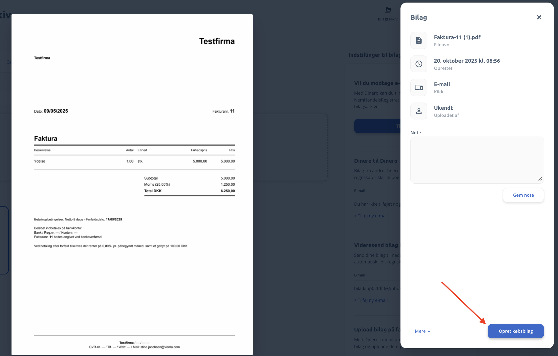 Ønsker du at bogføre et bilag med det samme, kan du trykke på bilaget og herefter på knappen “Opret købsbilag”.