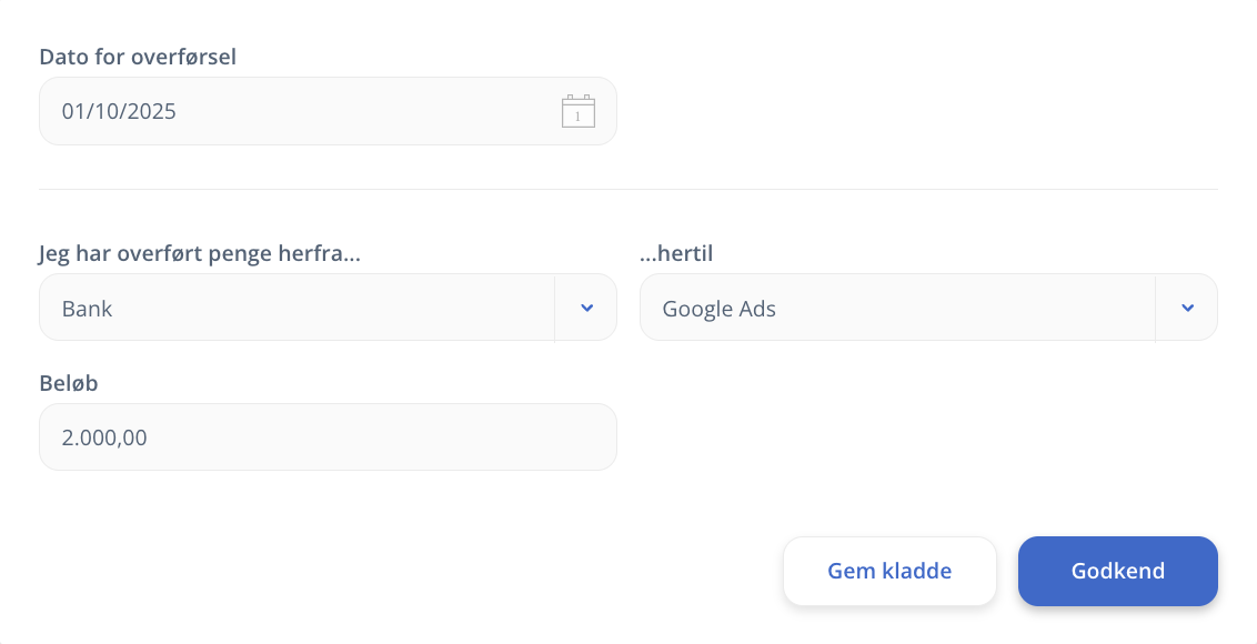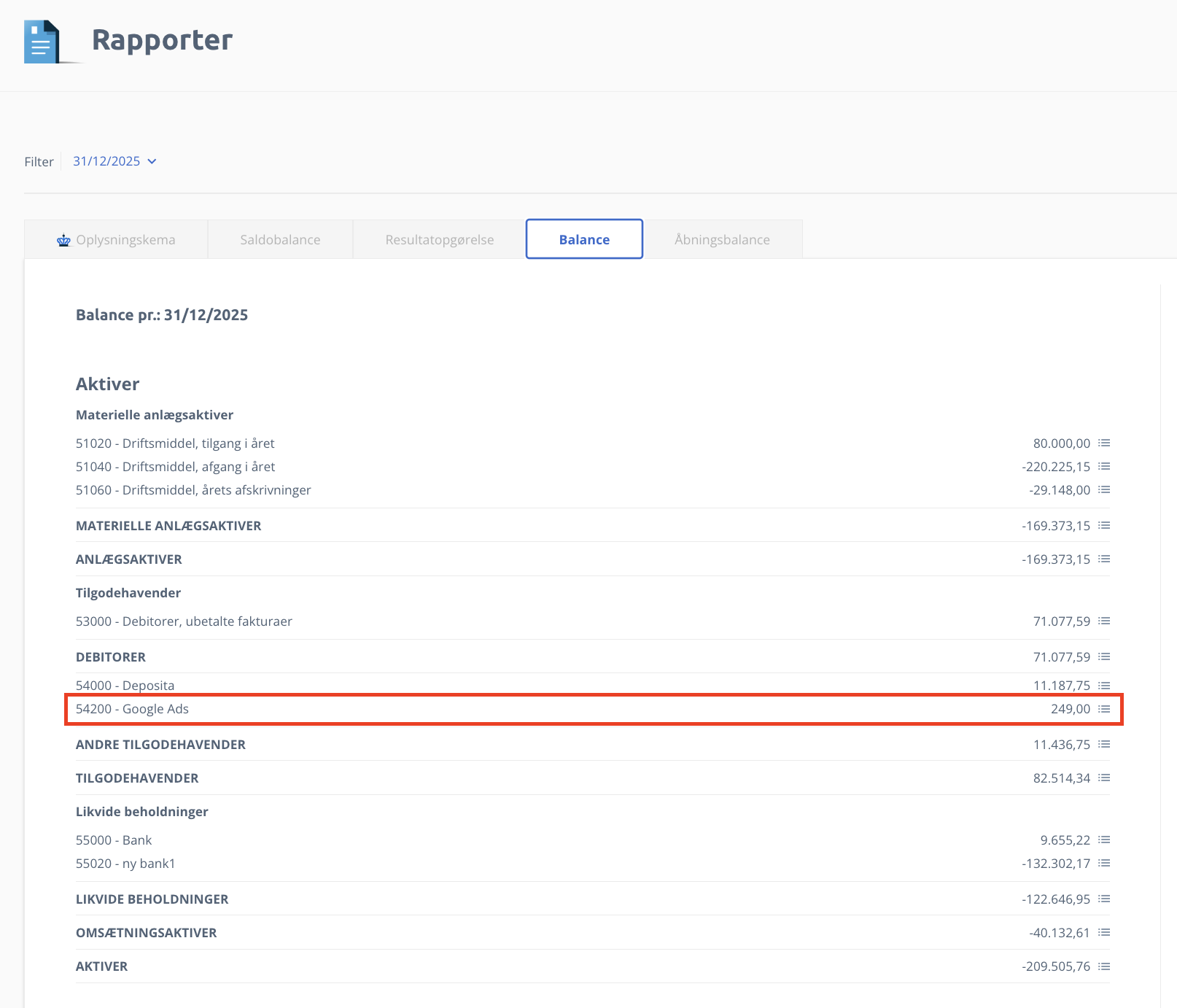 I vores tidligere eksempel indbetalte vi 2.000 kroner til Google Ads, og nu skal fakturaen bogføres.