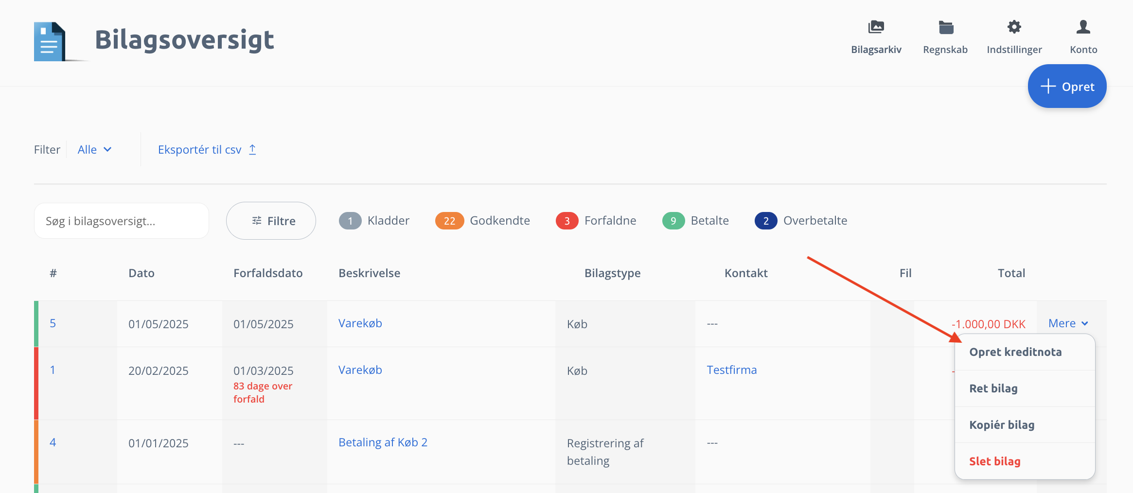 Find den relevante købsfaktura, der skal krediteres, og klik derefter på Mere → Opret kreditnota ud for bilaget.
