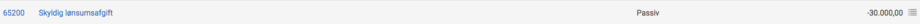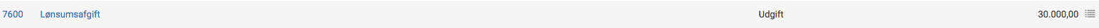 Vi bogfører på samme måde vores beregnede lønsumsafgift for februar og marts måned, så vi i alt har bogført en kvartalsvis skyldig lønsumsafgift på 30.000 kr. (10.000 * 3 måneder). Disse posteringer vil du kunne se som en udgift på dit overblik.