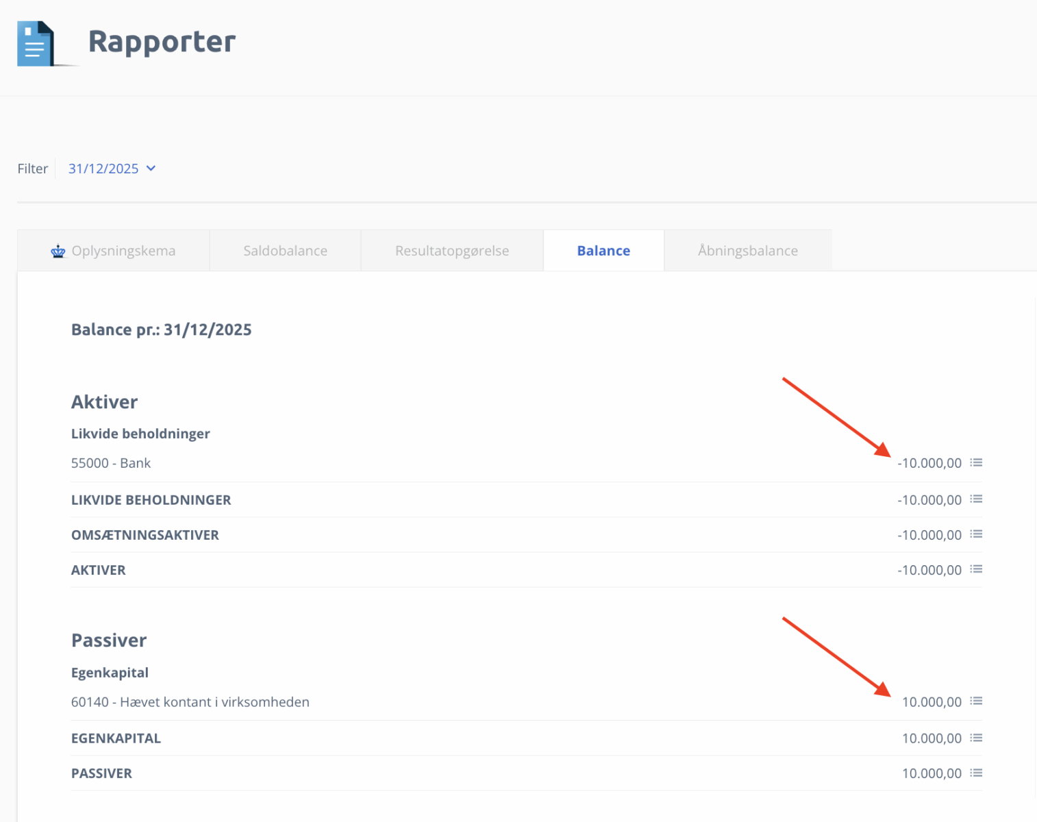 Når din løn er bogført, kan du se det i din balance. Her er fremgår der -10.000 i dine aktiver på konto 55000 – Bank (eller den konto pengene er hævet fra), og 10.000 i dine passiver på konto 60140 – Hævet kontant i virksomheden.