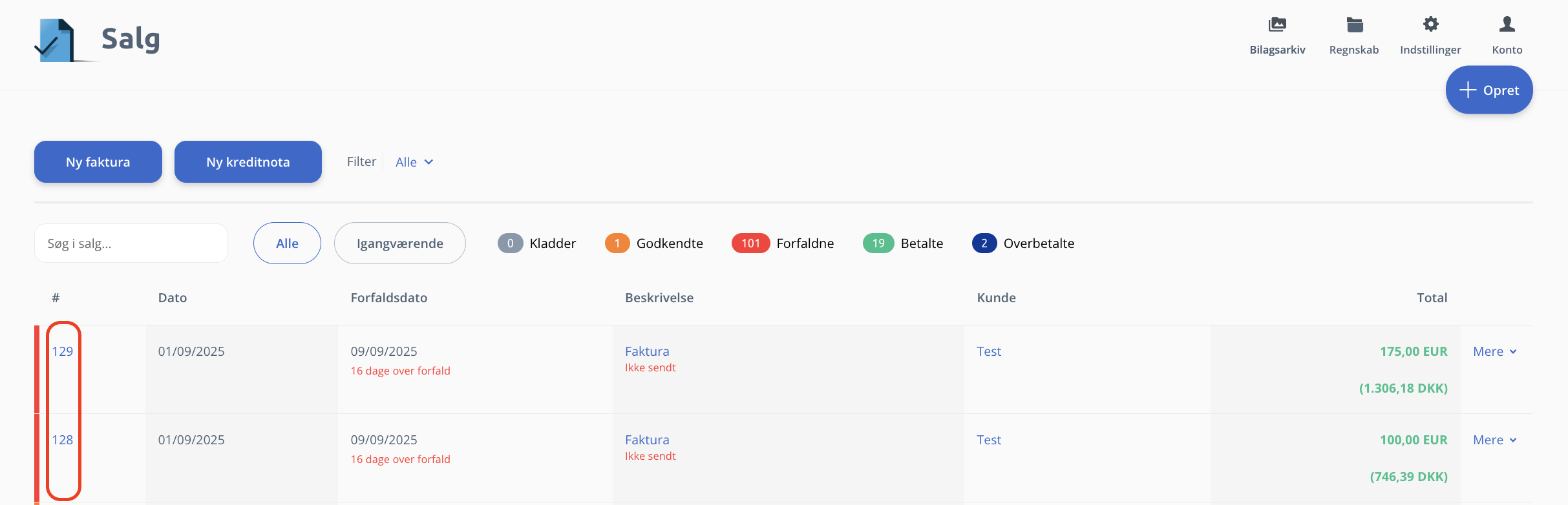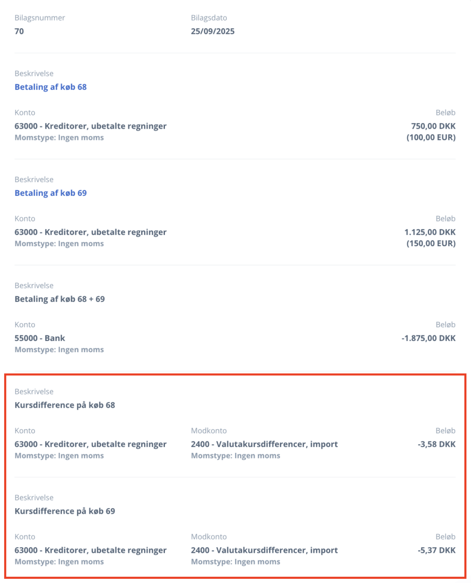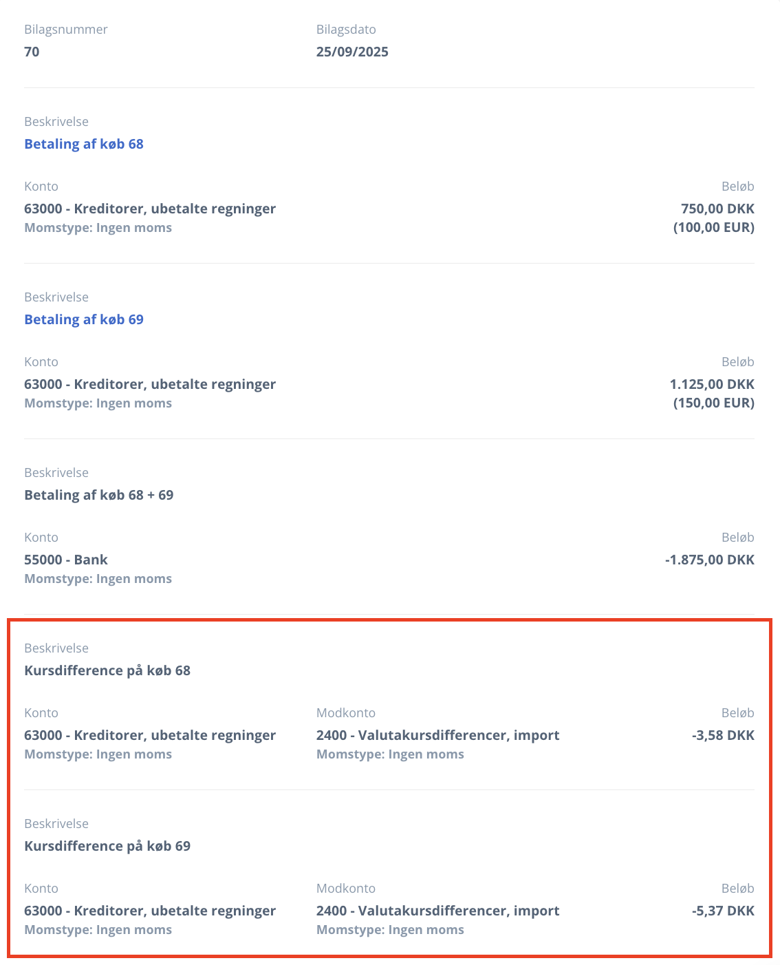 Tilbage i bilagsoversigten er de to kreditkøb (Bilag 38+39) nu betalte med bilag nummer 40, og din bogføring er dermed komplet!