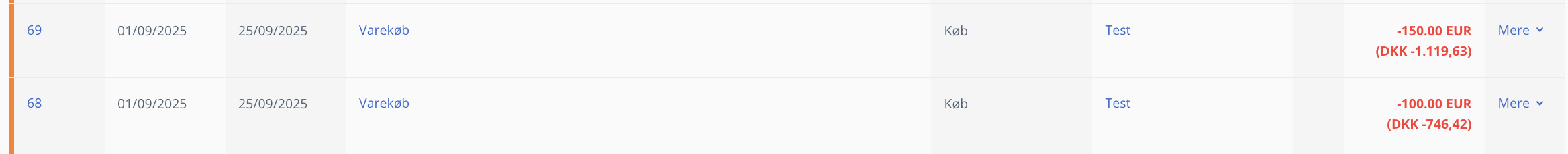 I eksemplet nedenfor gennemgås først selve bogføringen af kreditkøbene i punkt 1 og herefter registreringen af den samlede betaling i punkt 2. Har du allerede oprettet dine kreditkøb, kan du med fordel springe til punkt 2.
