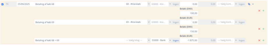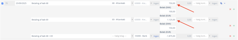For at få næste linje knyttet til samme bilagsnummer skal du trykke på det grønne plus ude til højre. I næste linje vælger du på samme måde køb 39 og indtaster 1.000 kr. under Beløb.