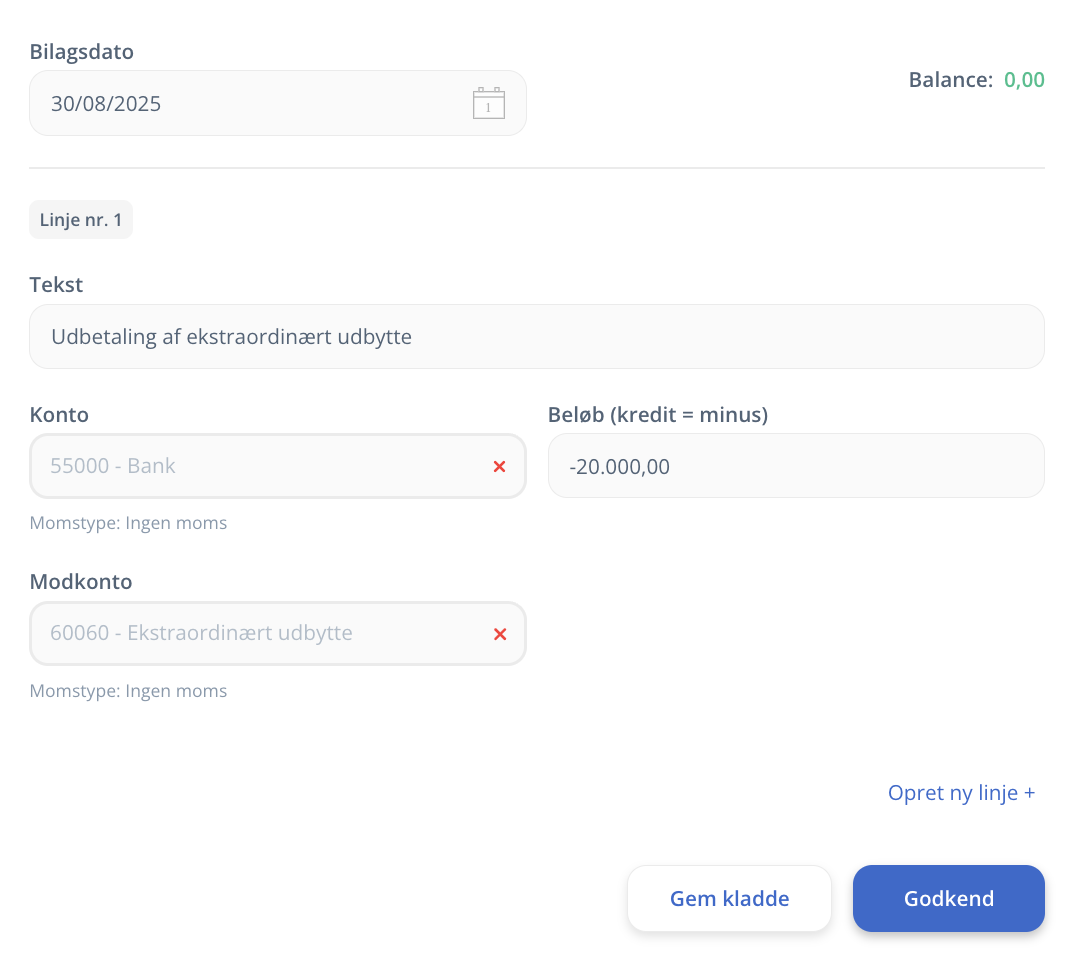 Nu skal udbetalingen af det ekstraordinære udbytte bogføres. I nedenstående eksempel har vi udbetalt udbytte den 30/08/2025 på 20.000 kr.