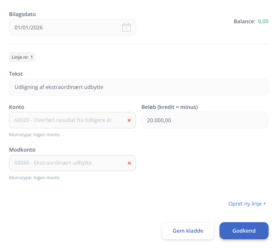 Når du har bogført udbetalingen af det ekstraordinære udbytte, skal du huske at udligne kontoen på første dato i næste regnskabsår. Dette gør vi for at nulstille saldoen på konto 60060 – Ekstraordinært udbytte, da det allerede er udbetalt i det seneste regnskabsår.
