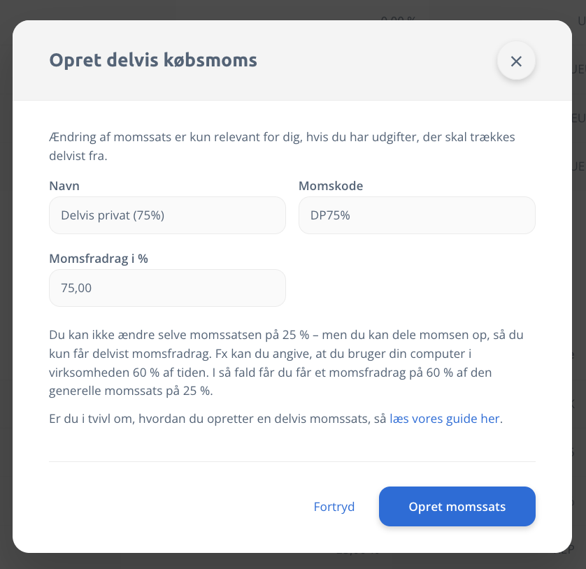 Momskoden, som er oprettet, er med 75%, hvilket vil sige, at der er 75% momsfradrag for udgiften, som i sidste ende giver en moms på 17,65 %.