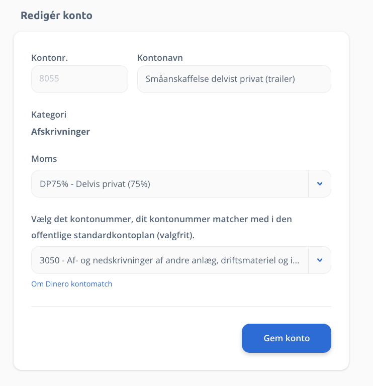 Det er her vigtigt, at der i i boksen, hvor man beskriver sit køb, IKKE vælges et af de forslag, som Dinero Crowd kommer med (fx hvis du har Dinero Pro). I stedet vælges den nyligt oprettede konto “Småanskaffelser delvist privat (trailer)” manuelt fra kontolisten og beløbet indtastes.