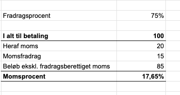 Her dividerer man 15/85 for at få momsprocenten, som giver de 17,65 % af den fulde udgift på 100 DKK.