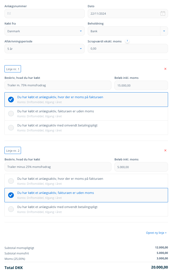Tryk på Opret → Nyt køb og udfyld dit køb som vist på billedet nedenfor.