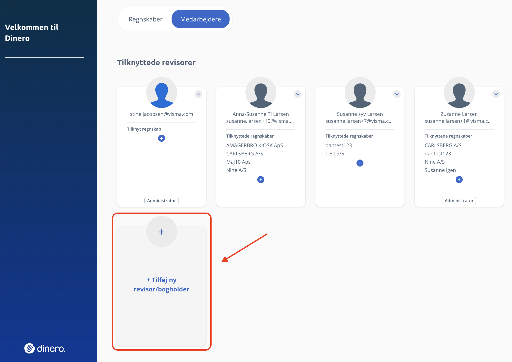 Når administratoren er logget ind i Dinero, skal vedkommende gå ind i admin-modulet, hvor der findes en funktion til at tilføje nye medarbejdere. Her klikker administratoren på knappen “+ Tilføj ny revisor/bogholder”, hvorefter administrator kan indtaste din brugermail og samtidig vælge, om du også skal have administratorrettigheder eller ej.