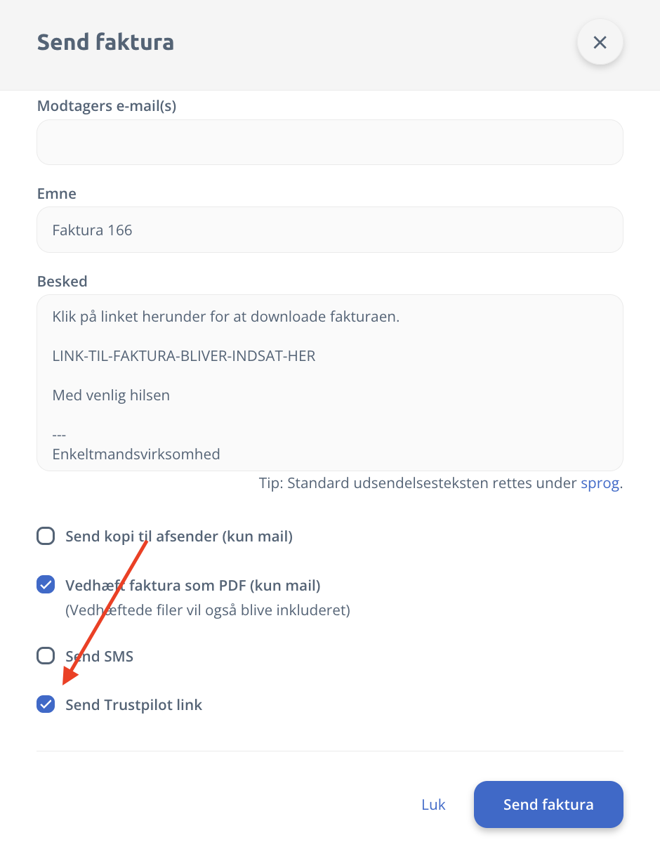 Som Pro-bruger kan du sende et Trustpilot-link med ved afsendelse af faktura til din kunde!