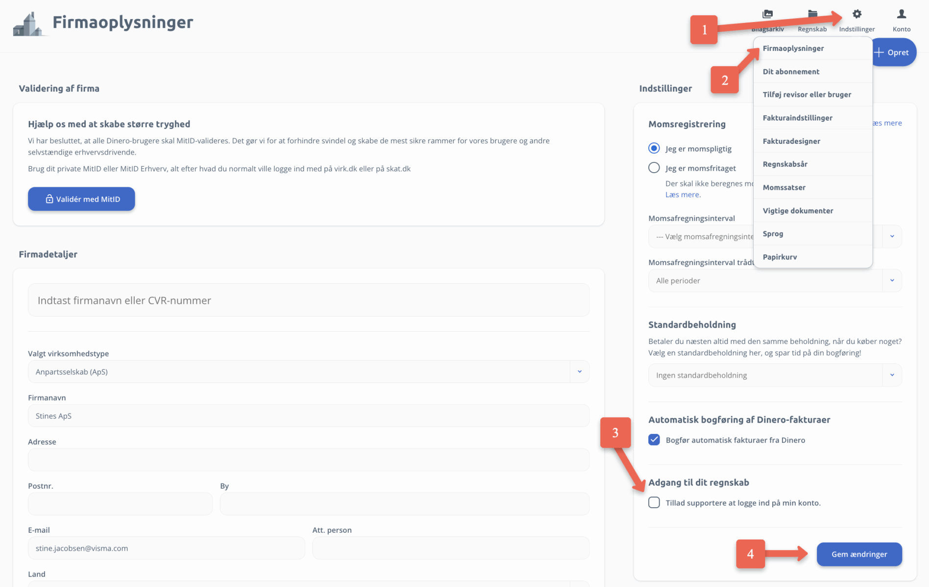 Du kan give os adgang til dit regnskab ved at klikke på Indstillinger (tandhjulet oppe i højre hjørne) → Firmaoplysninger → Sæt et flueben ud for “Tillad supportere at logge ind på min konto” (under “Adgang til dit regnskab”) Gem ændringer.